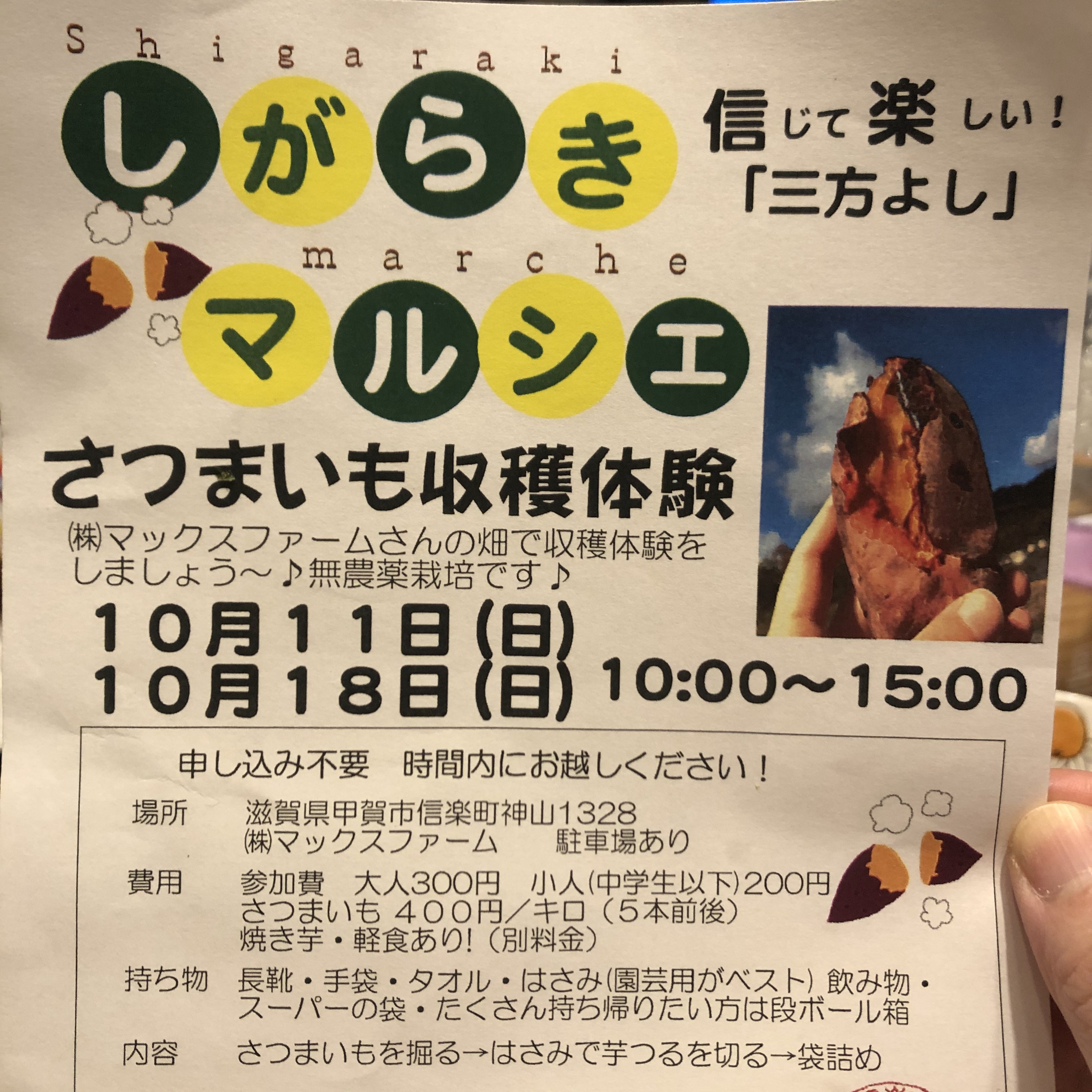 2020年10月11日、18日開催予定の信楽マックスファーム(株)のお芋掘り体験に、10月11日(日)に行ってきました!