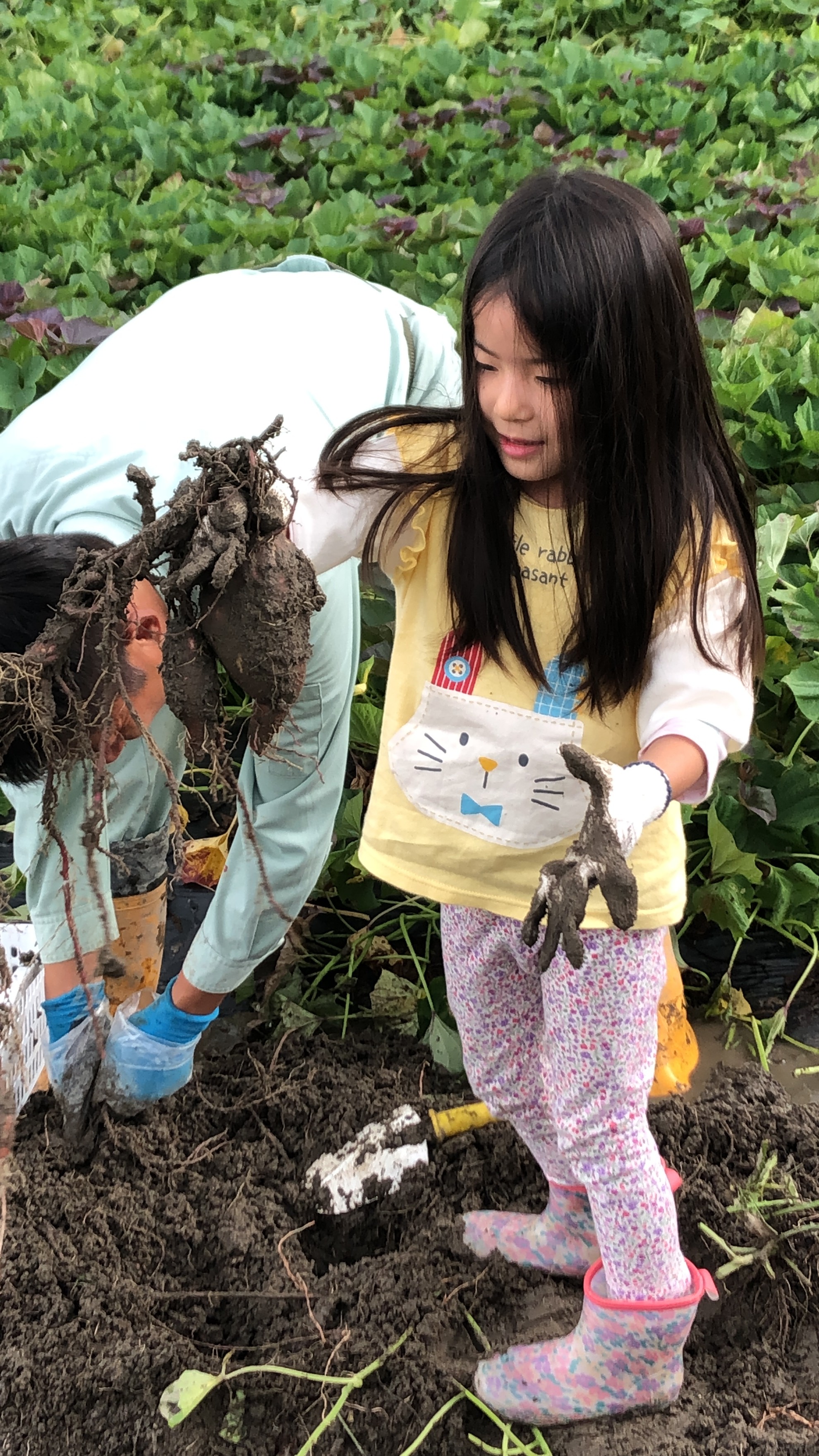 いざ畑に入ると、男性スタッフが、土の払い方、どこにお芋があるかなどを丁寧に説明してくれ、5歳の女の子は、教えられるまま、ほぼ自分でお芋を探すことができました。3歳の男の子は、初めこそ手が汚れるのを警戒していましたが、お芋が見えたのが分かると、一生懸命に掘り出し、1株からこんなに収穫できるのか、と思うほどとれました。