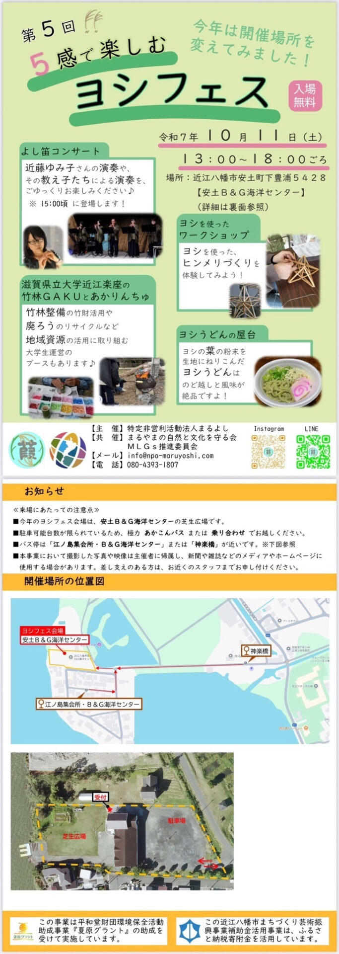 10月11日(土)の13時から、近江八幡市安土B&G海洋センターにて「5感で楽しむ ヨシフェス」が開催されます。