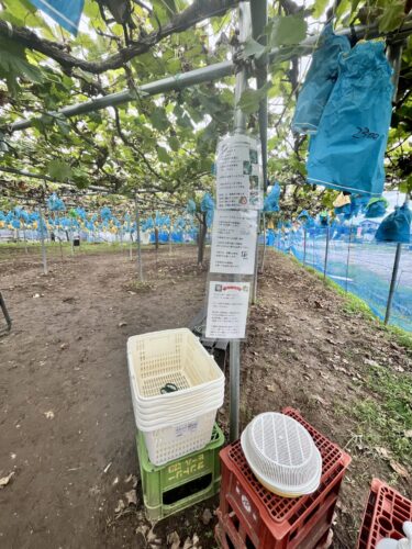 入り口でカゴとハサミをとって、さっそく美味しそうなシャインマスカットを選びます。
