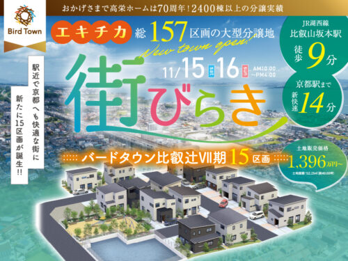 高栄ホームでは、11月15日(土)~16日(日)にバードタウン比叡辻Ⅶ期街びらきを開催します! (※雨天の場合も開催いたします。内容は予告なく変更になる場合がございます。予めご了承ください。)