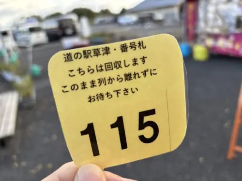 道の駅草津では、並んだ順番に整理券が配られるシステム。入荷数は300個。一人2回までガチャガチャができるので、整理券は150枚配られるそうです。