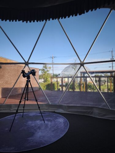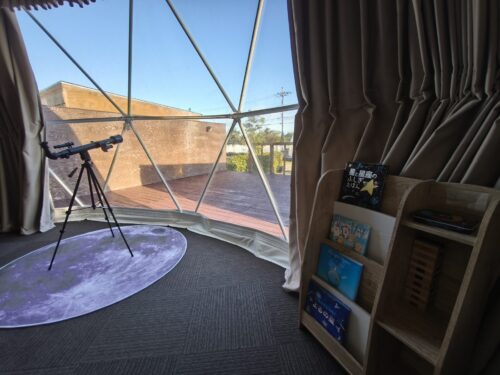 絵本やおもちゃ、天体望遠鏡まであるおしゃれなドームテントは冷暖房完備。