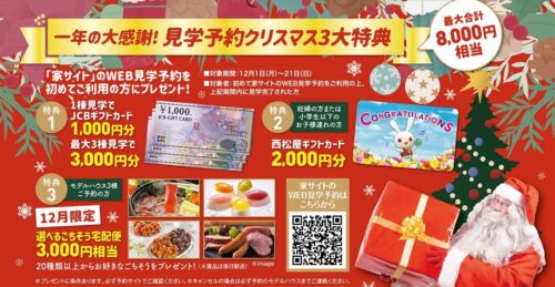 今なら一年の感謝を込めて、家サイトのWEB見学予約を初めてご利用の方に、最大8000円分相当のプレゼントがもらえるチャンス★