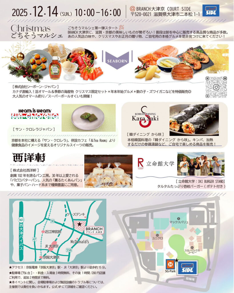 滋賀・京都の“おいしいもの”が一度に楽しめる「クリスマスごちそうマルシェ」が、2025年12月14日(日)BRANCH大津京で初開催されます!