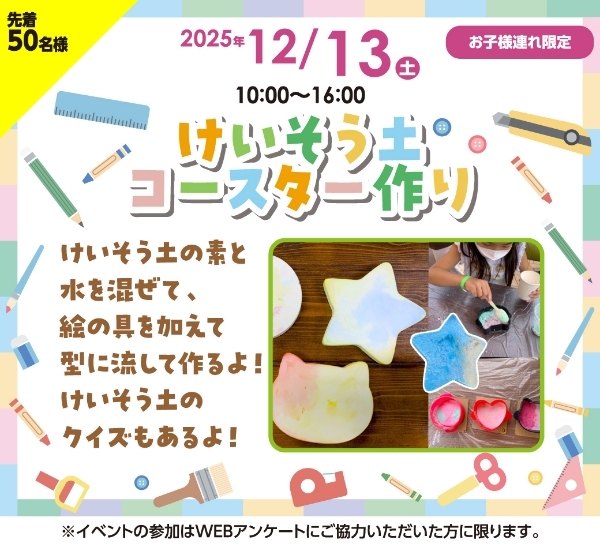 12/13(土)子どもが喜ぶ!けいそう土コースター作り&14(日)グルメキッチンカーがやってくる!in近江八幡