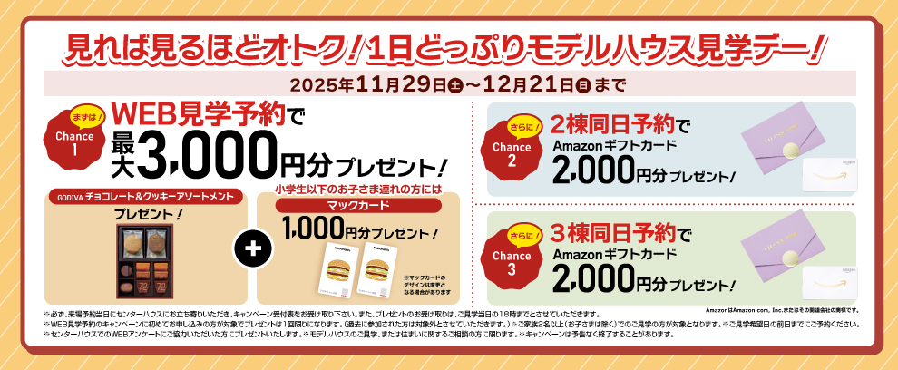 ・複数のモデルハウスを見学されてもプレゼントは1回限りになります。