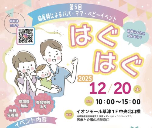人気企画ぜ~んぶ参加無料!プレママも親子連れも家族みんなで楽しめる♪2025年12月20日(土)、イオンモール草津で【助産師によるパパ・ママ・ベビーイベント はぐはぐ】開催!参加特典も♪特別イベントに参加して、素敵な思い出を作ろう!!