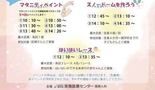 マタニティペイント・スノードーム作り・はいはいレースといったプレママ・親子に人気のイベントすべてが参加費無料!
