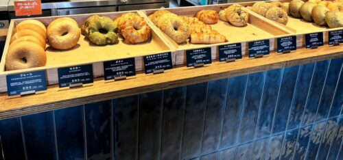 店内のカウンターには、滋賀県産の小麦「びわほなみ」と北海道産の小麦をブレンドし、国産の小麦100%で素材の味を大切に丁寧に焼き上げたというベーグルが並びます。
