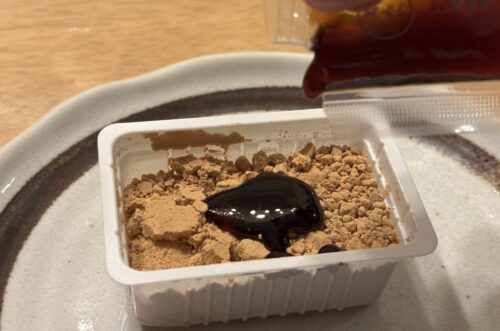 コシのあるしっかりとした羽二重餅。黒蜜きなこと抹茶の2種類があり、抹茶は、近江朝宮茶(あさみやちゃ)の抹茶きな粉をまぶしたお餅に、抹茶蜜をかけていただきます。