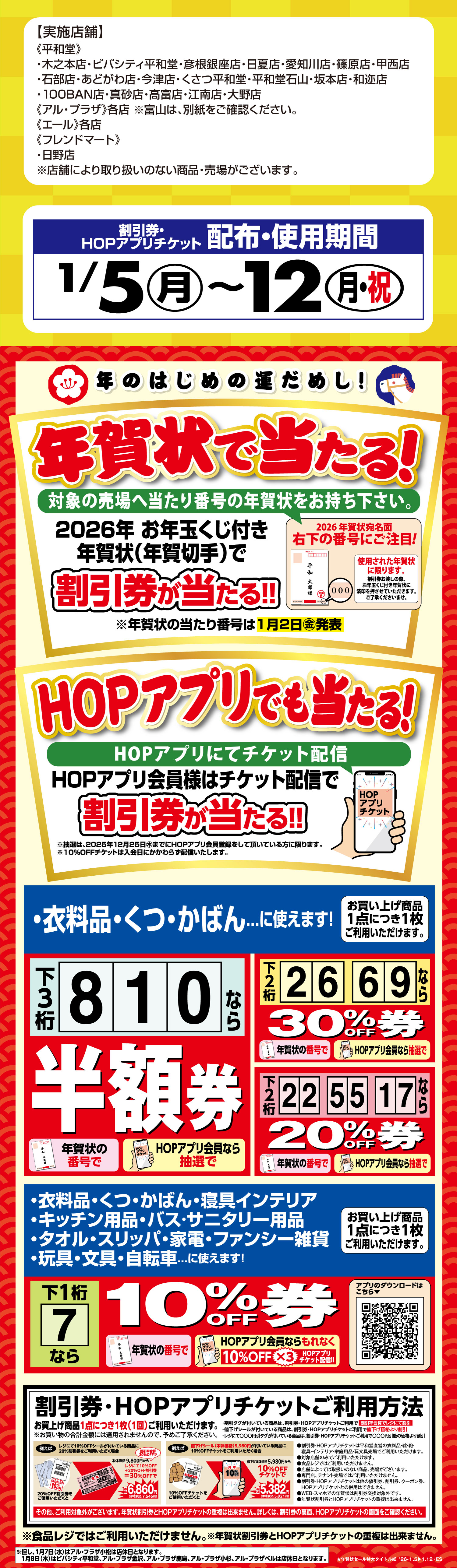 ついに発表!最大半額券が当たる2026年お年玉くじ付き年賀状の当選番号は…?アプリも要チェック!【配布・使用期間1/5~12】年賀状で当たる!割引券・HOPアプリチケット【平和堂・アルプラザなど】