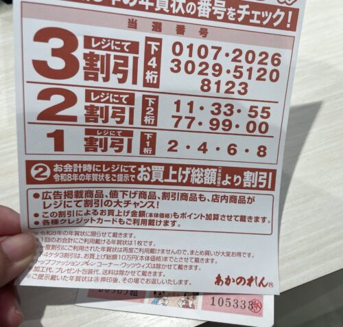 内容:お会計時にチラシに記載の当選番号の年賀状(令和8年)を提示でお買い上げ総額(本体価格)より割引