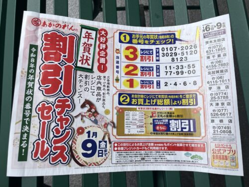 「年賀状割引チャンスセール」を開催中の、あかのれん大津京店に行ってきました。