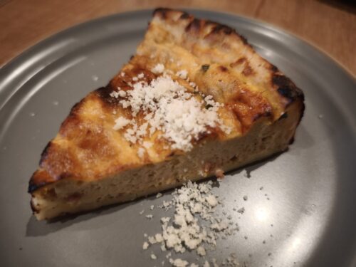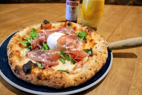 酸味とうまみのバランスが絶妙なソースに、香ばしく軽い食感の生地と、生ハムとクリーミーなチーズの風味があわさって、まさに絶品。