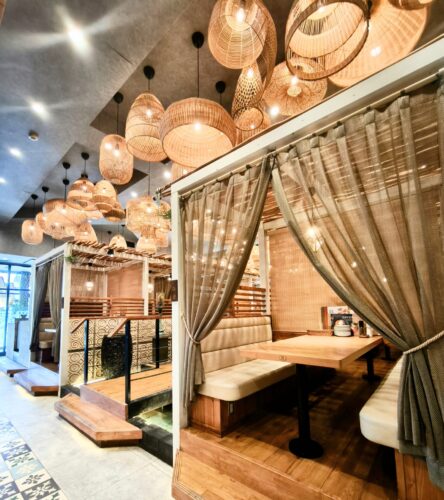 現地から買い付けたという味のある家具や照明、水のせせらぎと心地よいBGMが流れる落ち着いた雰囲気。