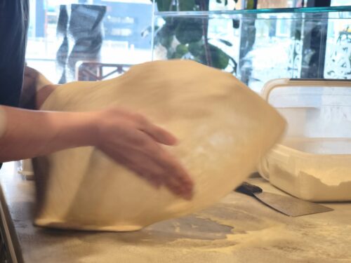 オーダーが入るごとに、厳選した小麦粉で作られた生地を一枚一枚見事な技でのばしていきます。