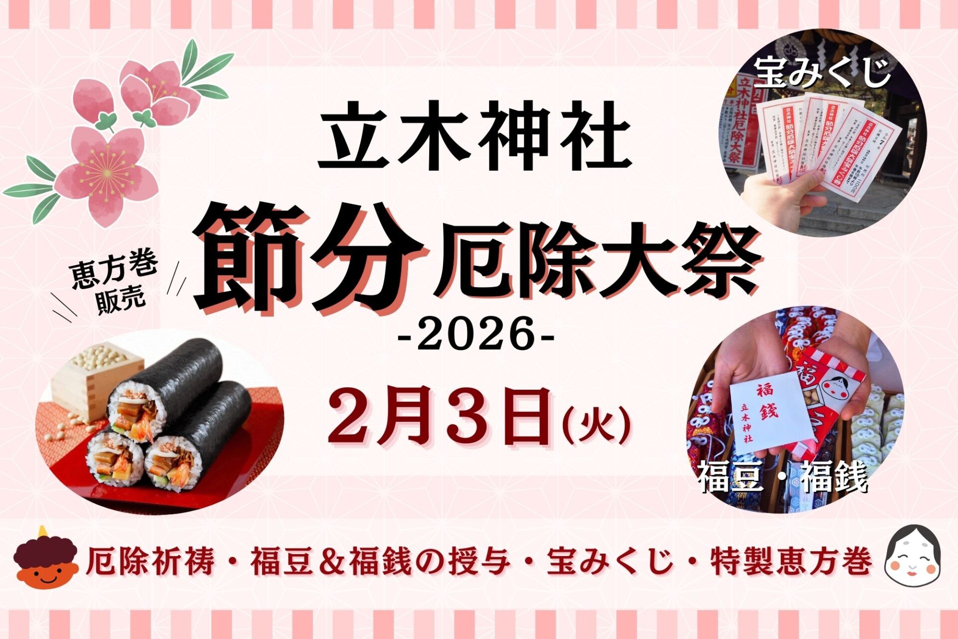 2026年の節分は2月3日(火)。厄除けの神「立木神社」では、厄を祓い、福を呼び込む「節分厄除大祭」が斎行されます。福豆・福銭の授与のほか、パパ・ママの厄除祈祷も受付中です。また、豪華賞品が当たる名物「宝みくじ」や、人気ホテル・名店が手がける特製「恵方巻」販売など、親子で楽しめる催しも満載!活気あふれる節分祭で、一年の福を呼び込みましょう♪