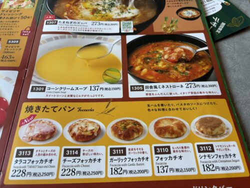 コーンスープやフォカッチャは、小食なお子さまでも食べやすそうでした。 サラダなどお野菜メニューもあるので、栄養バランスを考えながら選べるのもママには高ポイント♪