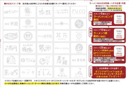 さらにスタンプを集めてハガキで応募すると、オリジナルTシャツやラーメングッズがもらえる特典も!