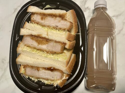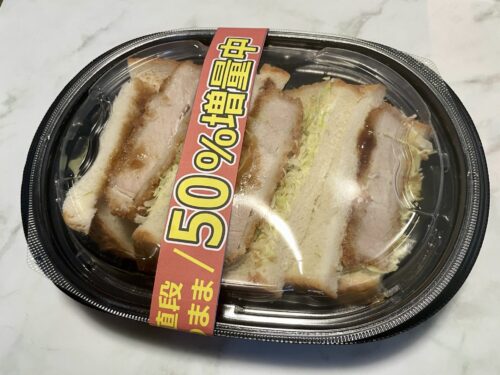 ローソン標準価格 495円(税込)で、カツサンドの個数がお値段そのまま50%増量しているとのこと。