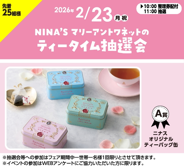 ママもうれしい♪2/23(月祝)NINA’Sマリーアントワネットのティータイム抽選会を開催!