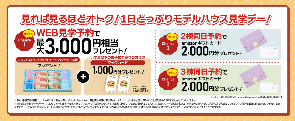 初めてWEB見学予約キャンペーンにエントリーされ、KTVハウジング近江八幡住宅展示場のモデルハウス一覧ページより見学予約された方、一家族様1回限りとさせていただきます。