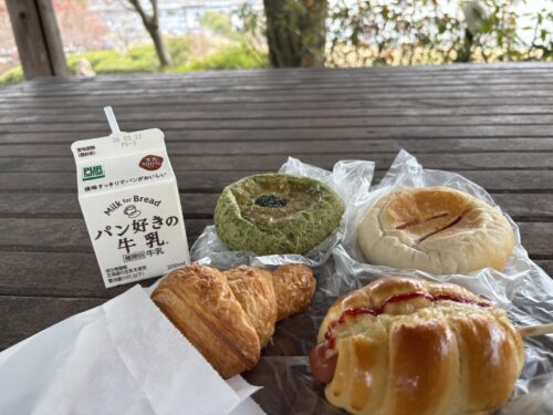 美味しいパンと、相性抜群の「パン好きの牛乳」を外でいただく時間は最高でした!よもぎあんぱんには粒あんと求肥が入っていて、もちもちで美味しかったです!
