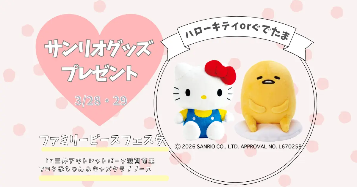 2026年3月28日(土)29日(日)の2日間、三井アウトレットパーク滋賀竜王で「ファミリーピースフェスタ」が開催されます。当日は「フコク赤ちゃん&キッズクラブブース」が登場。なんと...子どもが大好きなサンリオグッズがもらえるのだとか。「どうしたらもらえるの?」や「フコク赤ちゃん&キッズクラブって何?」など、気になる情報をお届けします!