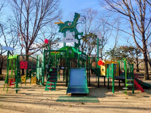 そんな美しい桜が楽しめる「妹背の里」。実は遊び場もさらに充実しています!2025年12月に新設された大型遊具は、竜をモチーフにした迫力満点のデザイン。フリーフォールやチューブスライダーなど4種類の滑り台が揃い、早くも子どもたちに大人気です!