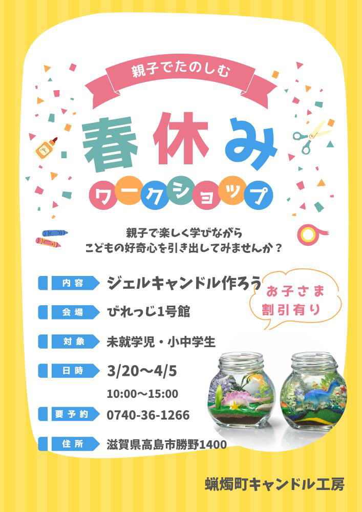 親子で楽しめる「ジェルキャンドル作り体験」が高島市にある蝋燭町キャンドル工房にて開催中です!