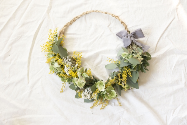 滋賀県でマルシェやイベント出店をされているコトノハさんを講師にお招きして季節の草花やミモザを使って可愛らしい春のお部屋にぴったりなリースが作ります!