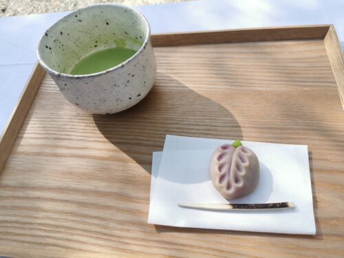 野点(のだて)形式で行われるため、開放的な空気の中で本格的なお茶の世界に触れることができます。お抹茶は老舗茶舗・千紀園の「喜寿」、主菓子は松利老舗による「藤」をモチーフにした季節を感じられる一品です。