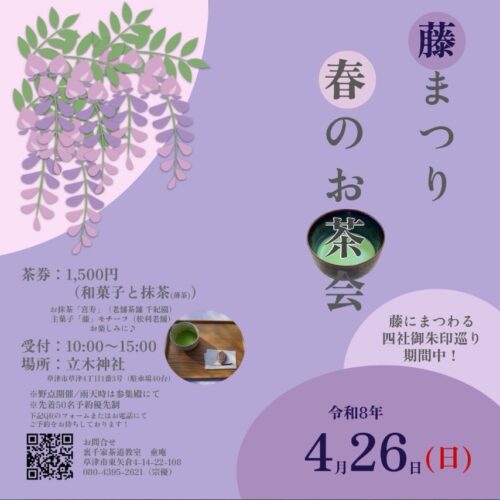 2026年4月26日(日)には、立木神社の境内で「藤まつり 春のお茶会」が開催されます。