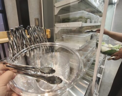ボウルとトングを取り、好きな具材を好きな量だけ入れていきます。