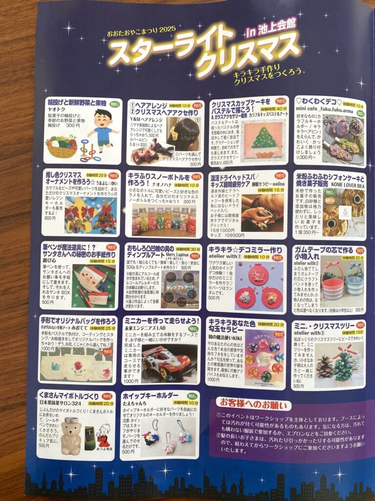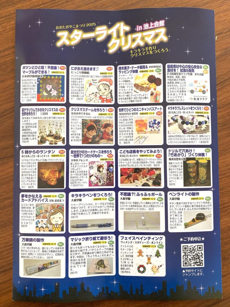 12/14(日) 10:30〜16:00 池上会館にて『おおたおやこまつり2025 スターライトクリスマスin池上会館』が開催されます。このイベントはワークショップを主体としています。