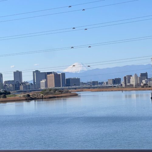お散歩がてら、こども達と多摩川沿いを自転車で走っていたら、なんと富士山が見えました!