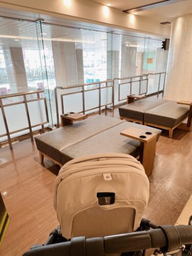 隣にベビーカーを置いても邪魔にならず、通路沿いなので赤ちゃんが多少グズっても周りを気にせず過ごせてママの休息時間にもってこいの場所です。