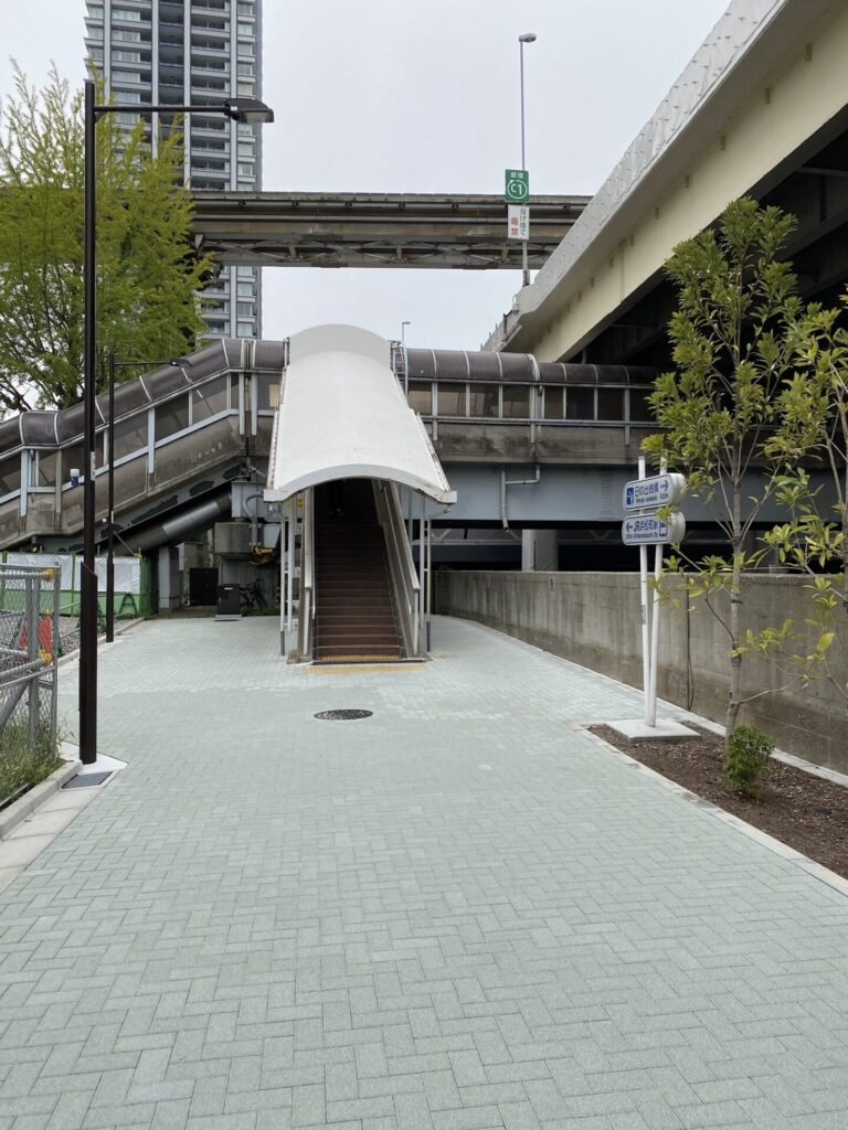 JR浜松町駅を南改札口から出て日の出桟橋方面へ歩くこと5分で『港区立新浜公園』に着きますが、この階段を降りるか、左手に進み半分ほどの段数の階段を降りなければならないのでご注意ください。