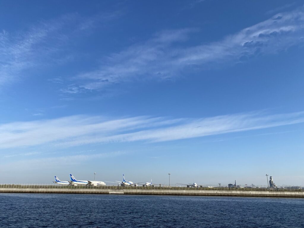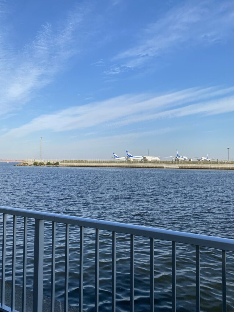 京浜島つばさ公園の対岸には羽田空港があります。写真では伝わりにくいのですが、停まっている飛行機も迫力があります。