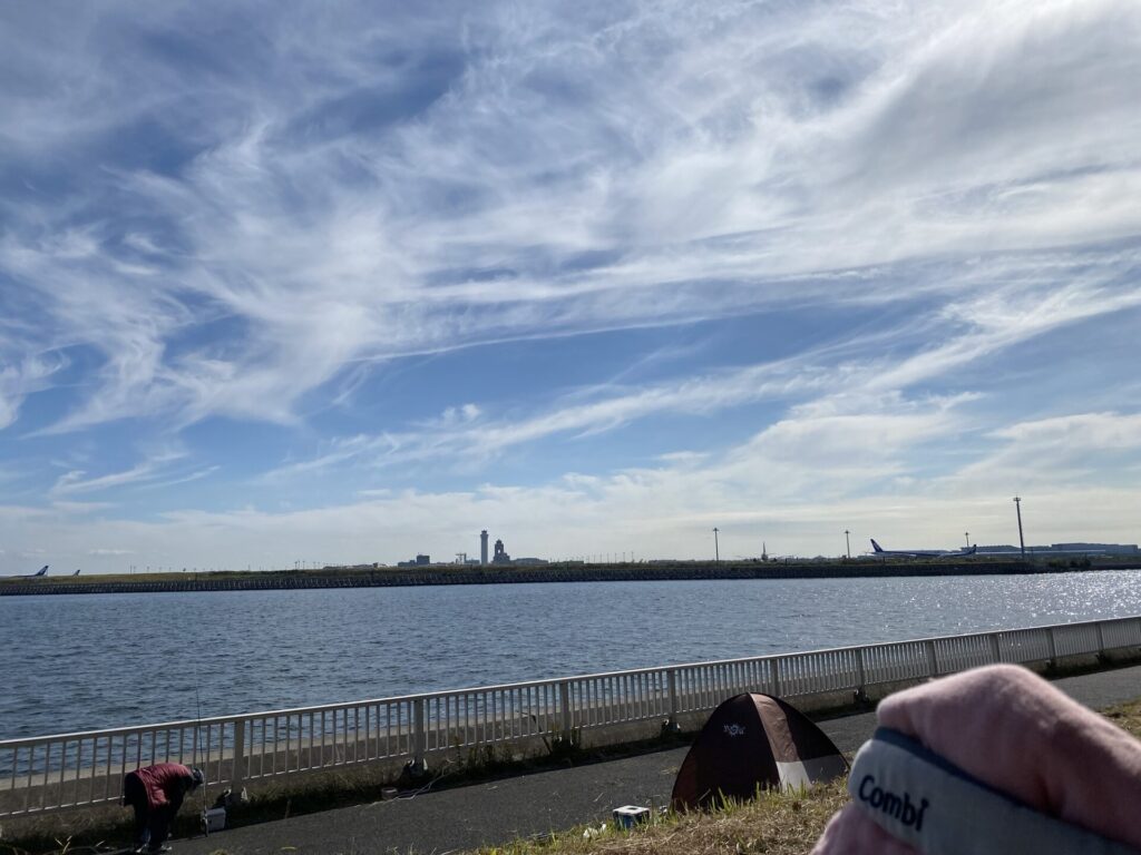 飛行機を眺めながら釣りをしている人や、お散歩している人がいました。