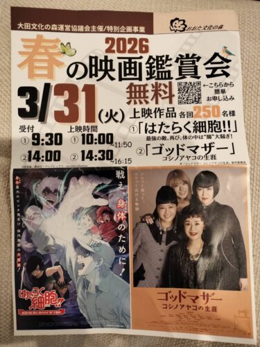 【大森】3/31(火)開催!春の映画鑑賞会/無料で「はたらく細胞」や「ゴッドマザー」が鑑賞できる!