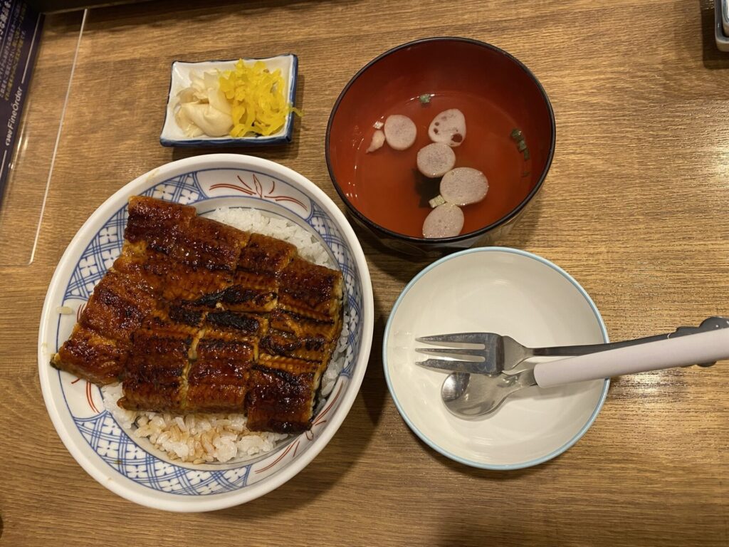 注文した鰻丼(並)です。子供用の食器も準備してくれました。ご飯の量も選べます。今回ご飯の量を『普通』で注文しましたが、『少なめ』にしても良かったなと思いました。