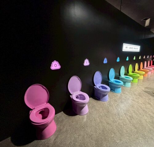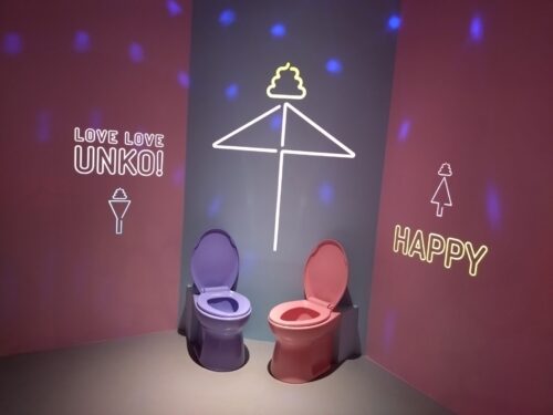 エントランスを入ると、まず目に飛び込んでくるのはカラフルな便器たち!好きな便器に座って「う〜ん!」と踏ん張ると、カラフルなうんち(プラスチック製)が出てきました!