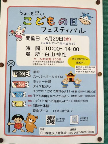 白山神社で、子どもが楽しめるイベント「こどもの日フェスティバル」が開催されます。
